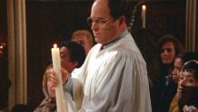 George gets a great parking spot that becomes a target. Kramer thinks that he has stumbled on the product of a genetic engineering experiment, a "pig man." Elaine and Jerry are nervous about the religious duties they must do when they agree to become godparents to a couple's newborn, including getting the Mohel and holding the baby for the circumcision.