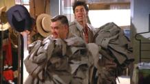 Jerry and his girlfriend get some time alone with each other at a movie, Schindler's List, they don't see it; however, Newman sees it and them. A delay in the shipment of the raincoats will make the Seinfelds miss their flight to France, George uses this as an opportunity to get his "little" brother back to his father. The Seinfelds manage to avoid meeting the Costanzas in New York City.