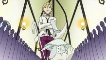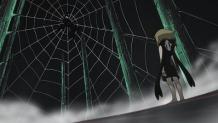 Stein’s research leads him to the theory that a certain heretic’s soul is inside the old golem. In the process, he finds a report about an incident in the Czech Republic where half a million people saw mysterious illusions that looked like spiders, and this causes him to conclude that the heretic scattered her body 800 years ago and left her soul in the golem. This heretic was the witch Arachne, and realizing makes Stein want to go help Maka and the others, but Shinigami-sama urges patience. Arachne is the mother of magic weapons, but creating one required the sacrifice of a witch’s soul. 800 years ago, she had been pursued by Shinigami-sama and had escaped into the old golem’s chamber. Back in the present, Maka and Crona are having a hard time dealing with Giriko and the golem, and Maka finds herself unable to move her body after getting sprayed with a special silk. Spiders then appear all around them and combine to form Arachne’s body.