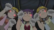 Riding through the halls underneath Shibusen in an attempt to catch up to Eruka and Free, Kid is stopped briefly when he reaches a field of bombs floating in the air. He’s disgusted by the lack of uniformity in the arrangement of bombs, and he only manages to get past after Patty authoritatively tells him to. Back down the long passageway, Maka uses her new-found power and fighting style to go toe-to-toe with Chrona, but the madness is literally overwhelming Soul. Inside of herself, the calm Maka uses this chance to match her soul wavelength with Chrona’s, and this brings her to a desert world where she finds a young Chrona. At around this same time, out in Death City, Blair is having no problems handling the members of the Mizune family.