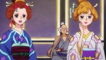 Wano’s top courtesan Komurasaki is in procession and slowly makes her way to Orochi Palace. There is a crowd of people on the street as well as Sanji and the others. While everyone is fascinated by her, some seeking vengeance get in the Oiran’s way.