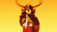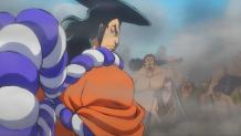 The Fiery Monk, materialization of the destructive ire of the Kurozumi clan, continues his deadly descent into the castle and instills fear in both the ranks of Kaido's pirates and those of the samurai. Orochi, all excited by the scenes of panic, suddenly hears a sound that brings back happy memories.