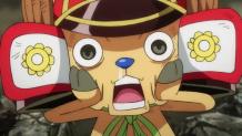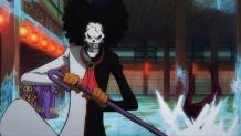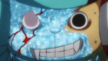 Luffy arrives at the ruins of Oden Castle following Law and finds the graves of his friends, Kin’emon and the others. As Law starts telling the already-stunned Luffy about the creepy story of Kin’emon’s ghost, Luffy sees it coming towards him!