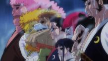 As Luffy’s heart pounds in a funny way, the Five Elders reveal the secret behind the Gum-Gum Fruit. Meanwhile, Orochi tries to convince Komurasaki to escape with him, but when he sees Kanjuro, he makes a malicious decision.
