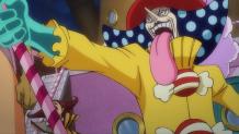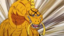 After sending the yokozuna Urashima flying, Luffy and his clan continue their search for Bakura Town’s boss to save Otama! They finally find the boss, Holdem, one of the Beast Pirates’ Headliners, and Otama who is hanging in the mouth of a lion in Holdem’s stomach.