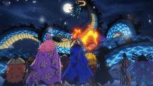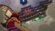 In the Flower Capital, the Fire Festival is about to end. On Onigashima, the battle between Luffy and Kaido is getting even more intense. However, Kaido who is excited about having a strong opponent starts drinking too much.