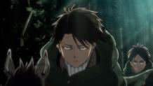 The Female Titan has captured Eren after ripping him out of his Titan body, but Mikasa and Captain Levi give chase. Elsewhere, the Recon Corps begins preparations for the journey back home to the Wall with their numerous dead in tow.