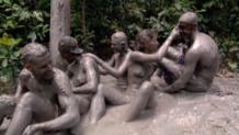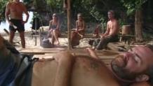 The number of contestants is whittled down to the Final Four after the players compete in “Witch Hunt” for Immunity. The castaways are each given a video camera and must search through the jungle for hand-carved masks and answer questions on the back of them. For a Reward---a night at a bar with a hot meal and a cold beer---the tribemates see who can collect the most mud on their bodies and transfer it to a designated area in a given time.