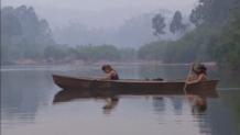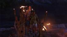 The players try to win fishing tackle in the “Water Torture” Reward Challenge, which requires them to carry jugs of water over a narrow plank and fill buckets being held by a tribesmate on a cane pole. “Lock Step” is the Immunity Challenge. The castaways are tied together with rope and traverse over and under obstacles until they reach the finish line.