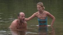 Jerri accuses Kel of eating contraband beef jerky, which he denies. In the “Butch Cassidy” Reward Challenge, the players jump off a cliff into a pool of water, swim to a floating crate and carry it ashore to win blankets. “Tucker'd Out” is the Immunity Challenge. The tribemates eat aboriginal foods (“bush tucker”), such as cow brains, grubs, grasshoppers and mangrove worms. However, Kimmi, a vegetarian, refuses to join in.