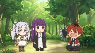 Stark complains of hunger and Frieren uses a spell to make him feel full, despite her disapproval.