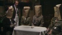 A meeting is held, with Monsieur Alphonse posing as the fence and everyone else wearing paper bags on their heads. The painting is exchanged for the gold weight from the cuckoo clock. Later, the Germans decide that they'd rather have cash, so René arranges for the gold to be exchanged for forged currency. The swap is made in the church, in the confessional booth. There's a cockup and the Germans inadvertantly pass the gold on to the priest.