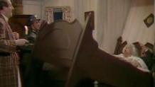 Monsieur Alphonse, who made the Murphy bed, arrives to pry the couple out while Mimi tries to feed them soup through a hole using a bellows. Meanwhile, von Flockenstuffen reveals his plans to kidnap Churchill, pulling rank on the recovering von Klinkerhoffen. Herr Flick has von Smallhausen sprung from prison and the pair arrive just as the dynamite goes off in their faces and frees the newlyweds. That night, as von Flockenstuffen is being entertained in the café, Helga and Bertorelli spring von Klinkerhoffen. Von Flockenstuffen demands to visit the cellar, taking with him one of the dynamite candles. Von Klinkerhoffen arrives to relieve him just as the candle goes off.