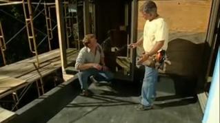 Landscape contractor Roger Cook shows host Kevin O'Connor Mount Auburn Cemetery — America's first landscaped cemetery featuring 5,500 trees and many notable graves. Back at the house, general contractor Tom Silva shows Kevin how he's creating a modern look inside by using minimal wood trim around the windows. While the garage slab is poured in the garage, landscape contractor Roger Cook starts installing 18 tons of bluestone in the front courtyard. In the kitchen, tile contractor Joe Ferrante shows master carpenter Norm Abram how he's reusing old slate (should be bluestone) from the front entry to extend the old kitchen floor using a traditional mud job. Kevin lends Tom a hand building a small deck on the flat roof off the guest suite.