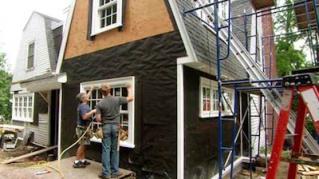 General contractor Tom Silva replicates the old exterior trim details around the new windows in the addition using cellular PVC that will never rot. Master carpenter Norm Abram installs the pre-hung Douglas fir exterior door for the back entry. Architect Paul Rovinelli takes host Kevin O'Connor on a tour of a recently renovated Dutch Colonial Revival that makes the most of its small footprint. Back at the house, Tom gets some help from homeowner Bill Pierce and his dad, Bill Pierce, Sr., as they remove the old bookshelves and plaster wall to gain entry into the new library addition.