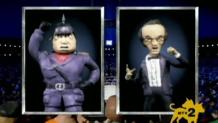 Hugh Grant steps into the ring, and his first challenger appears: Clint Eastwood. But Clint isnt so very powerful after all, he is knocked out of the ring, and Hugh jumps down on him, and Eastwood gets pulverized.