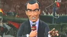 2 - The newscaster Sam Donaldson was at the spot of the explosion, and when he tried to steal the show, Nick and Johnny appears and starts kicking his ass, finally Johnny jams a microphone into Sam's throat and when Nick jams a water hose in his throat, the water and the electricity makes Sam explode.
