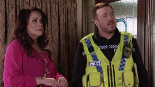 Sally, Brody, Shanice and Joanie visit Lou in prison and are horrified to see the mum is covered in cuts and bruises. Carl's also visiting, needling Debbie for cash. At No 6, everyone's been woken up way too early by baby Connie. Innocent George is taken to the police station in response to his client Annie's allegations of fraud.