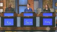Justin Waters, a resident physician from Royal Oak, Michigan; Cyndy Hawley, a retired adult basic educator from Morgantown, West Virginia; Christine Carrino Gorowara, a teacher educator from Wilmington, Delaware (whose 2-day cash winnings total $43,202).