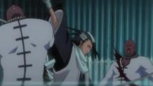 Kenpachi kills Tesla in one blow and tells Ichigo to stay out of his fight. He informs Ichigo that Urahara was tasked with making the Garganta into Hueco Mundo stable enough for the captains to enter, and that three others came with him. Retsu Unohana arrives with Isane Kotetsu, and persuades the Exequias to leave before healing Gantenbaine and Chad. Mayuri Kurotsuchi arrives and, despite Szayel creating a doll replica of him, remains confident that he can win. Byakuya arrives to save Rukia, and while Zommari nearly kills him with Gemelos Sonido, he manages to save himself with a technique that Yoruichi taught him.