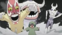Lunuganga catches Ichigo and the others by surprise and sucks them underground. They awake to find themselves surrounded by Hollow with Rukia missing. Suddenly, they are joined by a whole group of Menos Grande. Meanwhile, Rukia wakes up and has similar encounters with Hollows. She escapes only to find a couple of Menos herself. A strange figure with a mask appears to save her. Just who is this unknown person who wields a zanpakutou?
