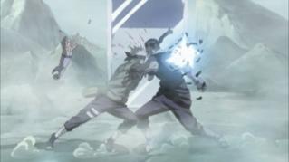 Kakashi and his division continue their fight against the Seven Ninja Swordsmen of the Mist. Suigetsu reveals to Jugo that he wants to reform his own Seven Ninja Swordsmen of the Mist and describes its former members including his brother Mangetsu with their corresponding blades they wield. As the mist gets thicker, Kakashi strategizes with a plan to bind Zabuza. Kakashi makes his attack against Zabuza but Haku blocks the attack. Kakashi recalls Naruto on their first mission as Naruto liked Haku and Zabuza because of their unique bond. Zabuza attacks Kakashi with his Executioner's blade and Kakashi evades even with Haku on his arm and having a sliced wound in his belly. Kakashi retaliates and successfully binds Zabuza. Meanwhile, the second division faces the white Zetsus and at the desert, the second Tsuchikage Mu appears and Gaara on a top of a rock anticipates the arrival of the enemy.