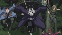 Having escaped from the Mountains' Graveyard, Sasuke wanders through a small town to discover that it is deserted, leading him to be confused. Meanwhile in the Hidden Leaf, Konohamaru and his team-mates patrol through the village in order to watch out for the enemy when they heard an angry voice of a prisoner from the Leaf's Intelligence Division. It is revealed to be Karin, who is feigning her mental instability to lessen the guards' attention and begins to plot her escape. At the same time, Jūgo and Suigetsu continue their search for Sasuke, arriving at one of Orochimaru's hideouts. The two walk in as Jūgo asks Suigetsu of his intention of joining Team Taka while suddenly Jūgo goes on a rampage and attacks Suigetsu. Suigetsu simply reforms and drowns Jūgo in order to subdue him.