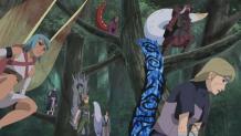 Suigetsu proceeds to show Sasuke the scroll that he found at Orochimaru's hideout earlier. After examining its contents, Sasuke's next motive is to meet with Orochimaru and explained to a confused Suigetsu that he is not one to die so easily as he has Jugo's assistance in reviving Orochimaru via the Curse Unsealing ability. Expressing shock that Sasuke would be the one to resurrect him, stating his intent to still take his body if he was in better condition, Orochimaru asserts that he shows no interest in the war. But when Sasuke then shows Orochimaru the scroll he was given earlier and states he wants to get answers from those who know everything, Orochimaru siphons back his stolen chakra from the immobilized Kabuto while agreeing to guide his former apprentice to the answers he seeks. Elsewhere, Naruto and the others watch on as Tobi moves forward with the revival of the Ten-Tails by revealing its actual body: The Gedo Statue. With Kakashi wondering why Tobi would bluff as the Eight