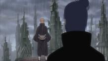Yahiko and Nagato attend a meeting with the Rain's leader, Hanzō. Other members of Akatsuki discover that Leaf's ANBU shinobi are also meeting with Hanzō, and suspect a possible betrayal. They attempt to catch up with Yahiko and Nagato, only to die at the hands of Zetsu and Obito who wanted Nagato to witness tragic reality just like Obito had when he'd witnessed Rin die at Kakashi's hand. Leaf's Root Division and their leader Danzō are revealed to have plotted with Hanzō to end the Akatsuki's rebellion, capturing Konan and giving Nagato an ultimatum: kill Yahiko or they will kill Konan. Choosing for him, Yahiko runs himself into Nagato's kunai, killing himself, leaving Nagato and Konan devastated. Enraged, Nagato uses his Rinnegan to slaughter the Leaf and Rain shinobi by summoning the Demonic Statue of the Outer Path, although Hanzō manages to escape. After this turn of events, Nagato finally turns to Obito, who witnessed the entire meeting. The final scene shows Nagato looking at Yah