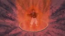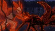 The chakra of the Nine-tails rages out of control within Sora, preventing Naruto and the others from subduing him. Asuma and Kazuma resume their old battle, while Kazuma justifies his actions with his duty as a pawn to the "King" of the Fire Country. Naruto is repeatedly knocked down in his attempts to restrain Sora, and the chakra seeps into him and transforms him as well. Yamato is unable to suppress the Nine-tails' chakra in both Jinchūriki, being prevented by an unknown outside force. Sora's fourth tail emerges, causing the Nine-tails's Cloak to envelop his body. He temporarily gains his own consciousness when he witnesses Naruto stab himself in the leg and successfully prevent the original Nine-tails' Cloak from emerging.