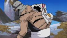 Hidan’s immortality enables him to stay alive even with his head cut off, although he cannot move his body. Kakuzu sews Hidan's head back on with threads that sprout from his body. Izumo and Kotetsu try to attack Kakuzu, but he manages to grab them both by using his body threads, restraining them and suffocating them as well. Hidan, now able to move again, returns to the circle and stabs himself with the blades of his scythe; he finishes it off by stabbing himself in the chest with another spike, fatally wounding Asuma.