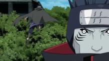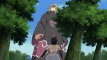 Upon encountering one another, Sasuke and Deidara engage in battle. After exchanging a few blows to test Sasuke’s strength, Deidara conjures up his specialty clay dragon and wages long-range attacks against Sasuke from high above. With Tobi’s backup support, the battle seems to be going to Deidara.