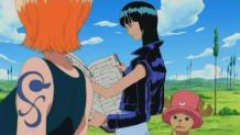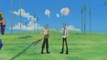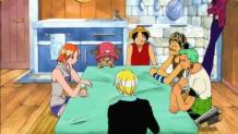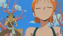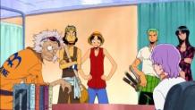 The crew meets at the docks and are surrounded by Marines. Using Nami as their fake hostage, they trick the Marines into letting them back on the Going Merry.