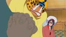 Robin and Usopp both disguise themselves as the same visiting inspector, and Usopp is thrown in the brig with Zoro. Luffy and Sanji are discovered by Jonathan after a slight mishap.