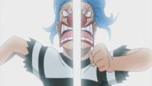While the battle between the Straw Hats and the Flying Fish Riders rages on, Zoro frees Hatchan from his cage, and the Fishman in turn saves him from an attack, revealing that he feels bad about their battle at Arlong Park. Meanwhile, Luffy crashes into Duval's hut and catches a glimpse of his unmasked face before being chased back outside. Once outside, Duval reveals that Sanji is the Straw Hat he wants to kill. After Luffy knocks his helmet off, the reason for his hatred is laid bare: Marines and bounty hunters have been relentlessly pursuing him because he looks exactly like the poorly-drawn visage on Sanji's wanted poster!