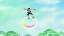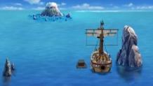 After Lina reveals that she has searched all over the ship, Luffy decides to destroy the ship in order to find Sayo. The Straw Hats manage to fight off Doran's men, but Doran unveils a large cannon and aims it at Sayo. Sayo tells Lina that their father truly cared for them and believed that his research would bear fruit, and left in order to protect them from his pursuers. The Straw Hats manage to rescue Sayo and destroy Spa Island, and notice that the X on Lina's father's map pointed to an X-shaped underwater volcano opening beneath the island. Several days later, Sayo and Lina complete the gem and send it to the Straw Hats, but as candy rain falls on the Sunny, Luffy accidentally loses it.