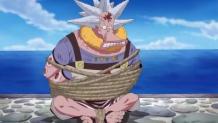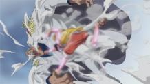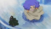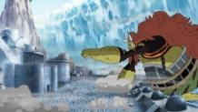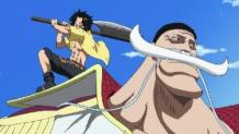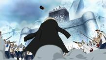 All the various Whitebeard Commanders show off their skills and abilities, as do some Marines. Akainu reveals his powers involve magma when he stops a giant ice block attack thrown by Diamond Jozu while Coby and Helmeppo question their worth in battle. Then Oars Jr., descendant of Oars, makes his way onto the scene.