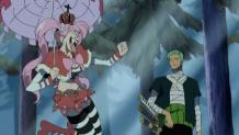 While heading to the sea to return to the Sabaody Archipelago, Zoro and Perona stumble upon a surprising discovery.