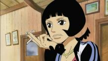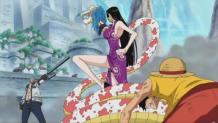 While stumbling around Amazon Lily, Luffy decides to find the head of the kuja pirates and looks for the highest building,he crashes into the bath where the snake princess was bathing and sees her back.