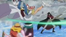 The sea-quakes made by Whitebeard cause a tsunami to come upon Marineford. But thanks to Aokiji freezing the water, any real potential damage is prevented. After the first attack, other soldiers join the fray, and the war really begins. While everyone is fighting, Mihawk decides to join the fight and attacks Whitebeard. The episode ends as the giant shockwave from the attack approaches Whitebeard.