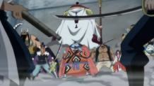 Usopp and Brook's attempts to attack Kizaru fail, but Rayleigh arrives, managing to block Kizaru's attack and hold him off. Luffy orders his crew to retreat, declaring the enemies impossible for them to defeat at this time, but Sentomaru and the other Pacifista bar their escape and even Chopper's Monster Point form is unable to turn the situation to their advantage. The real Kuma arrives and uses his Devil Fruit powers to make Zoro disappear.