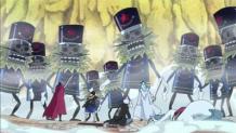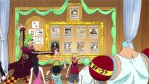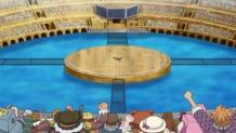 Meanwhile, Luffy and Franky arrive at the Colosseum, to take the Mera Mera No Mi, and to their surprise they meet a strange toy soldier like man with one leg as they all sign up for the big tournament that is happening..