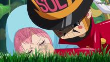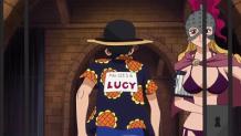 The episode starts with Luffy signing up for the tournament, and Franky requests Luffy to not let anyone discover who he is. Luffy was about to write his real name when signing up until Franky hit him, and now Luffy is 'Lucy', registered with the '0556' number on the back of his shirt. Luffy and Franky are separated now, Thunder Soldier looking at a board. Franky asks Thunder Soldier about the Don Quixote family, much to Thunder Soldier's surprise. Franky proceeds to ask about a 'factory'. Meanwhile, Sanji is seen with Violet, wandering around Dressrosa.