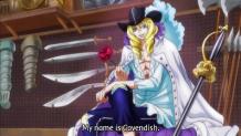 The famous beautiful pirate Cavendish makes an entrance, and proceeds to explain to Luffy (not realizing his identity) the rules of entertainment in the Colosseum, the nature and appeal of bloodsport, his past as a world-shaking pirate and lastly, his intent to kill The Eleven Supernovas for stealing his spotlight two years ago.
