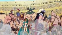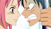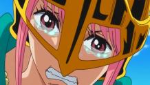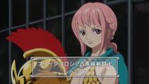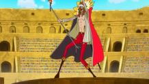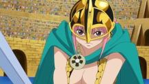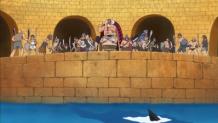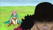 As Rebecca walks into the arena, she is booed by the audience. Luffy is angered and says that she is a nice person. One of the prisoners replies that everyone despises her because of her grandfather, the former King who destroyed the country many years ago.