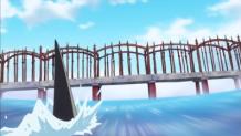 The scene changes to Trafalgar Law and his group, who are about to cross the bridge. They are atacked by a school of Fighting fish, but manages to get to Green Bit safely. Law is revealed to have Caesar's heart, the latter who is freed of his bonds for help. They also witness strange voices at a point on the bridge. Green Bit is shown to be a dense jungle.