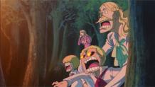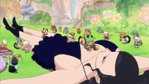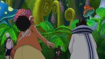 As they explore, Robin and Usopp discover a squad of Marines who are getting attacked by the forest's inhabitants, losing all of their belongings. As soon as the Marines fled, Robin uses her Devil Fruit power to capture the fast and seemingly invisible thieves. Usopp asks her what she has caught, and she tells him that she believes they are dwarves.
