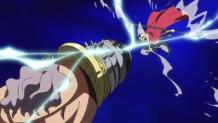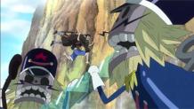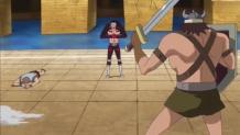 Luffy defeats Spartan after he tried to punch him several times. Luffy was about to be disqualified, until Sai broke in and stated that Spartan was the one who started the fight. Luffy thanks Sai. The Funky Brothers are arguing with Dagama, claiming he's 'forming alliances' in his block. The episode ends with Lucy searching for a new armor and Cavendish appearing, telling Lucy there is a weight limit.
