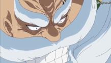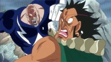 Luffy's battle with Chinjao rages forward as they both use Busoshoku Haki in the ongoing fight. During the match, Chinjao explains and then occurs a flashback when his head was functioning like a powerful drill. After some time, he lost a duel against Garp and had his drill suppressed in his head, which eventually was the main factor towards losing his fame, money and power.