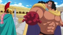 While Luffy stares in awe at a great bronze statue of a warrior, a gladiator, Rebecca, arrives and explains to him the legend of Kyros the Undefeated who disappeared from battle for 20 years. The announcer then calls out that the Block A battle royale is over and that the champion is a large man with a paper bag over his head. To the spectacle of the entire Colosseum, the man removes the bag and reveals himself to be Jesus Burgess, the captain of the first ship of the Blackbeard Pirates, who gestures and cheers over the broken bodies of his defeated opponents.